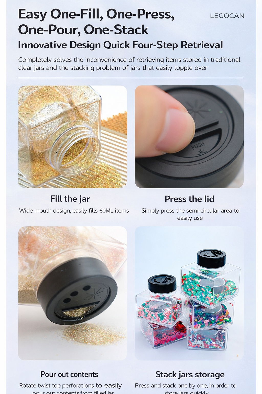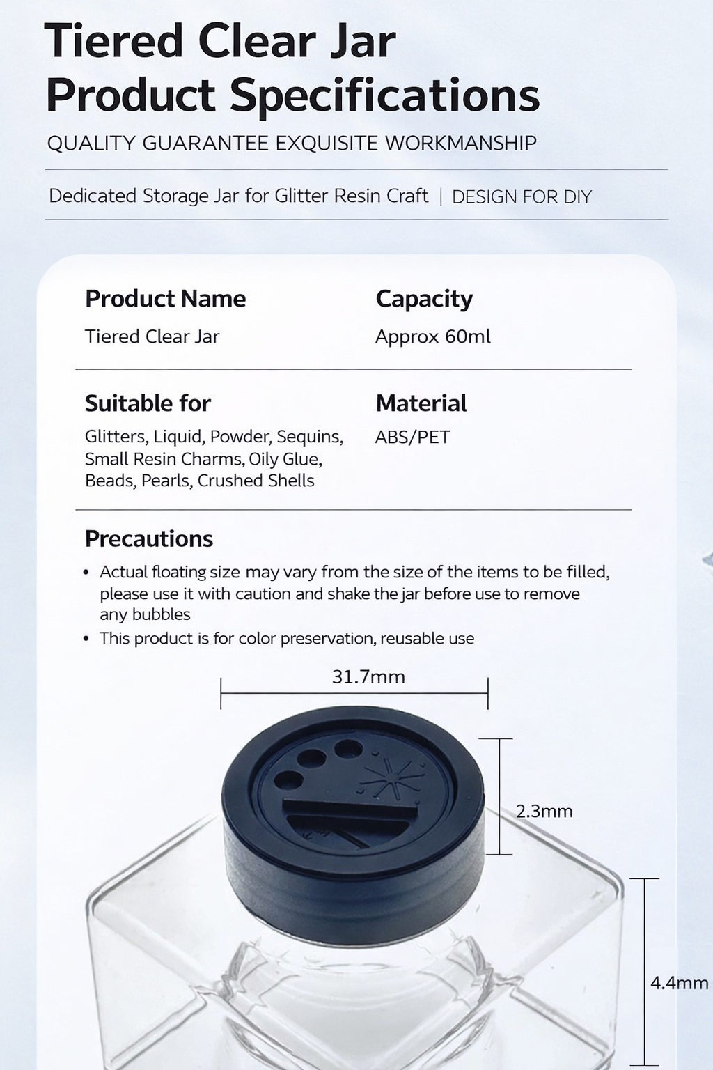 Bottles designed for clear product display. Suitable for glitter, polymer clay, etc.